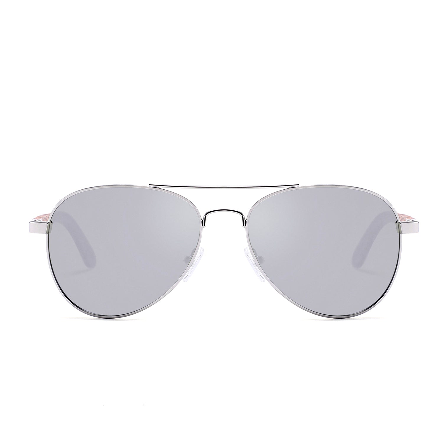MAVERICK SILVER Aviator Sunglasses Polarised Mirror Lens Wooden Arms