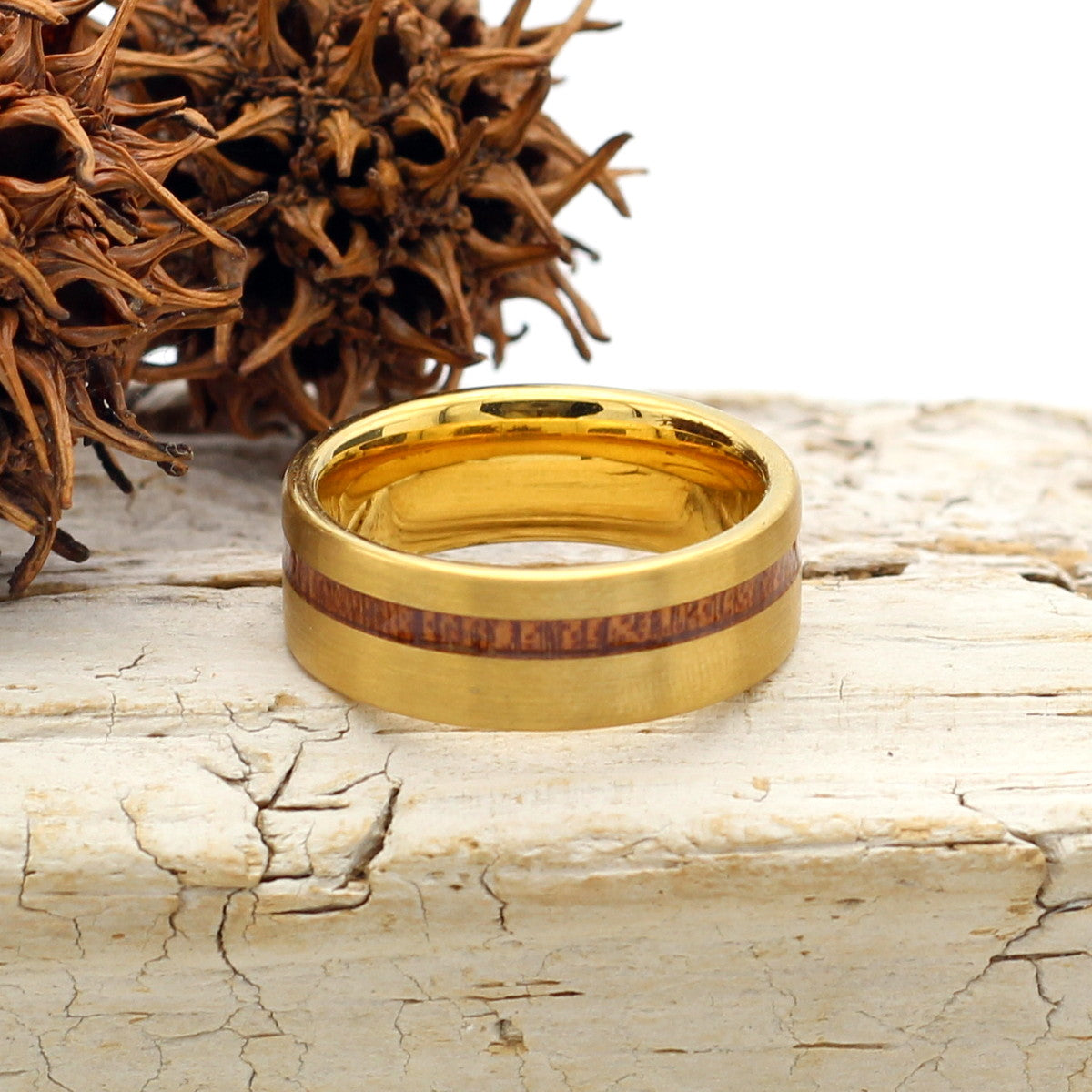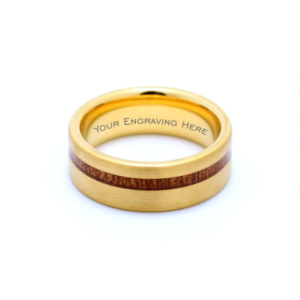 Men's Brushed Gold Tungsten Ring with Offset Wood Inlay